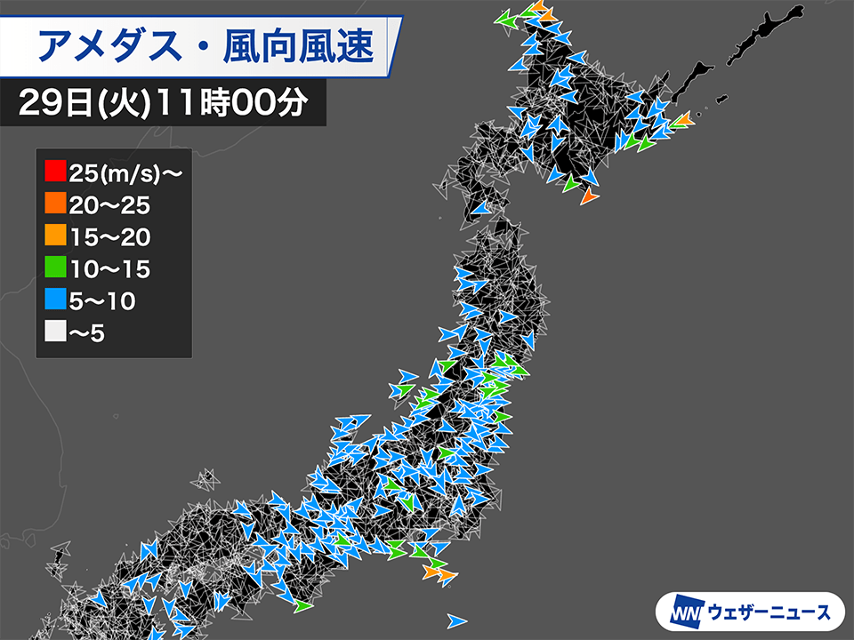 今日29日(火)は晴れている西日本や東日本も北西風の強く吹いているところがあります。こどもの日を前に、各地で揚げられた鯉のぼりも大きくなびいています。夕方にかけて強風に注意してください。