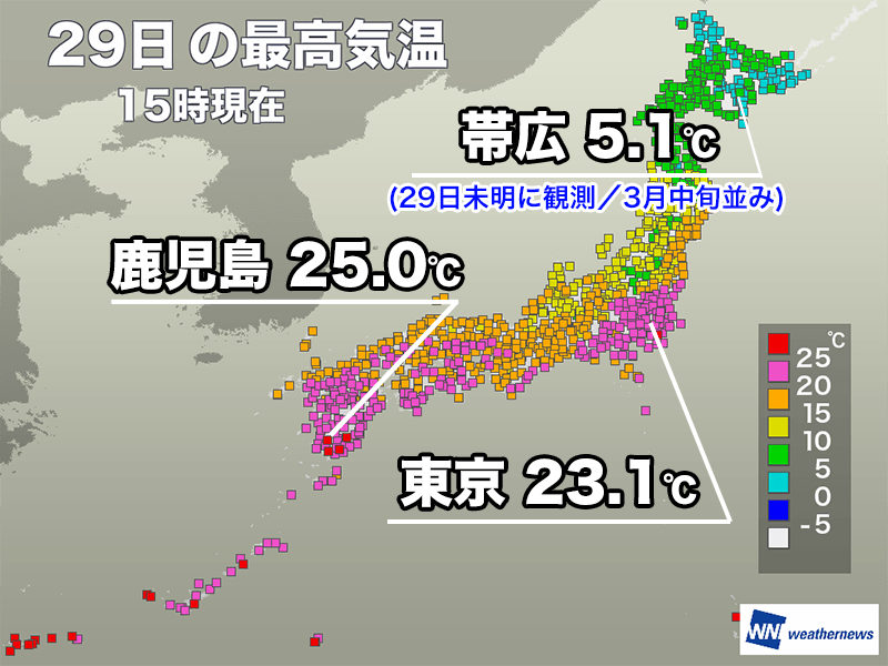 東京の最高気温は23.1℃でした。鹿児島では25℃を観測して夏日となりました。