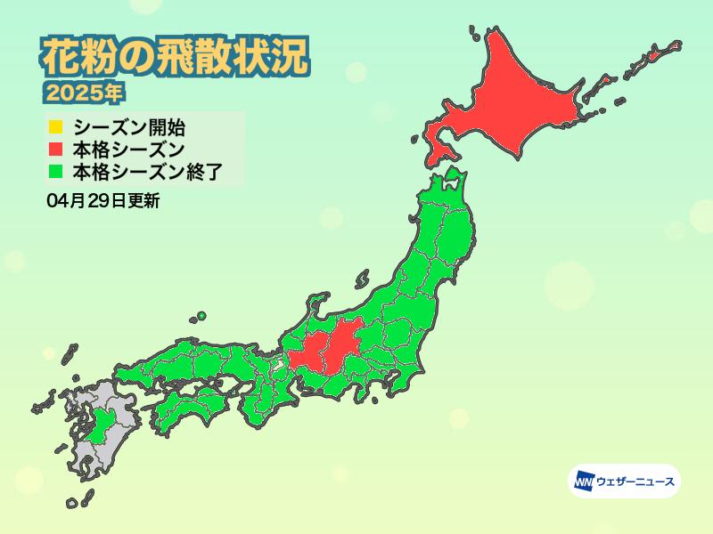 今日29日(火)までに愛知など8県で新たに本格花粉シーズンが終了したとみています。