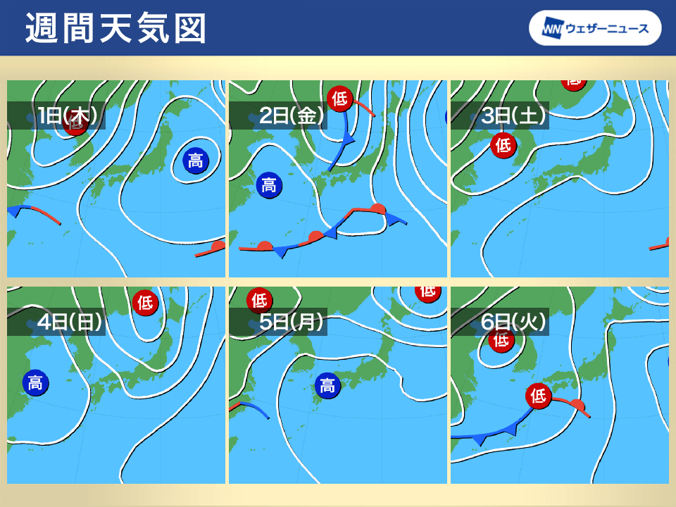 気温は連休期間を通して概ね平年並みで推移するところが多くなりますが、天気の移り変わりに応じて日ごとの変化が大きくなる可能性があります。体調管理や服装選びにお気をつけください。