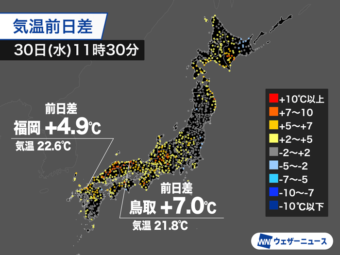 11時30分の気温は、福岡で昨日の同じ時間より4.9℃高い22.6℃、鳥取は7.0℃高い21.8℃を観測しました。長野県や岐阜県周辺でも昨日より7〜8℃ほど高くなっています。また、大阪は0.6℃高い19.0℃、名古屋は3.2℃高い20.7℃、東京では1.1℃高い22.5℃とです。