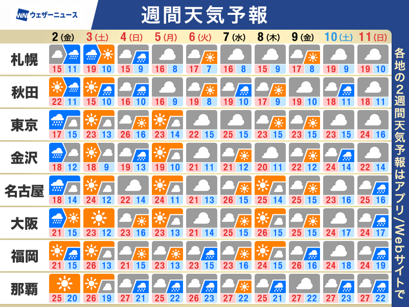 西日本や東日本では一時的に降り方が強まり、土砂降りの雨となる可能性があるため、2日(金)の外出には傘が必須となります。