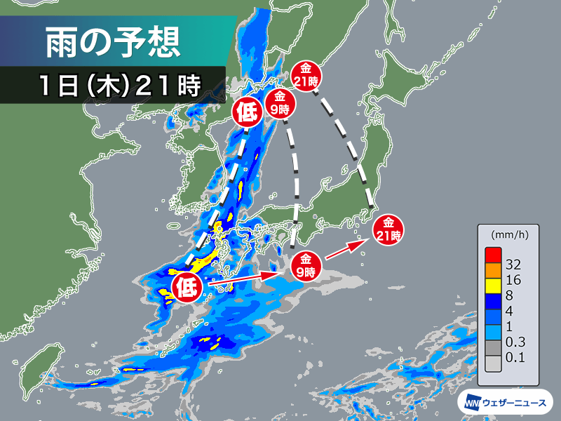 日付が変わって明日2日(金)の未明から朝にかけては中国・四国から近畿を活発な雨雲が通過し、特に近畿では明日朝の通勤・通学時がピークと重なる可能性があります。