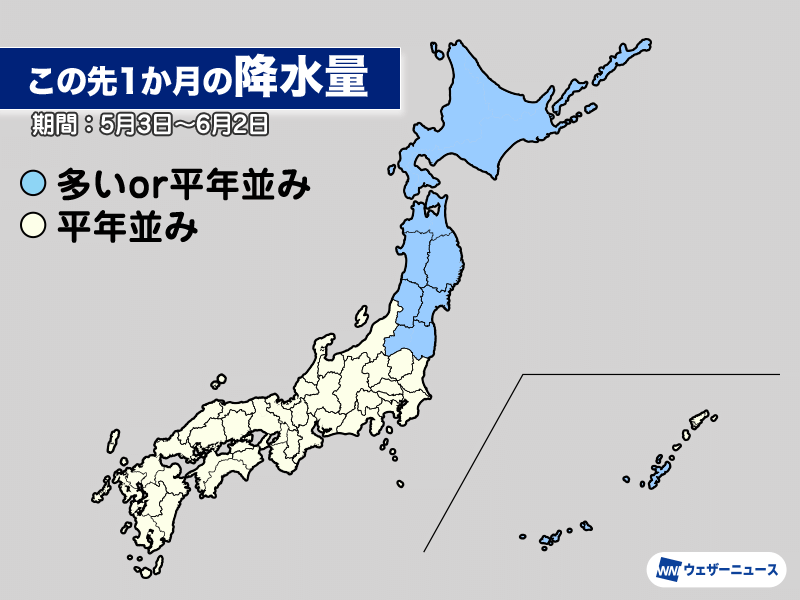 地上付近では中国東北区が低気圧となり、北日本では曇りや雨の日が多くなる見込みです。降水量は北日本で平年並みか平年より多い予想、東日本と西日本、奄美は平年並みの予想となっています。