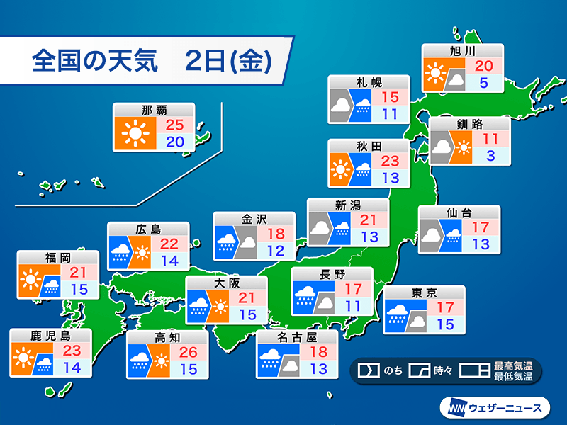 明日2日(金)は雨の影響で、今日ほど気温が上がりません。特に東海や関東は昼間の時間帯に断続的に雨が降るため今日に比べて大幅に低くなる見通しです。東京都心の最高気温は今日よりも7℃低い17℃、名古屋市は6℃低い18℃の予想で、少し肌寒さを感じるかもしれません。
