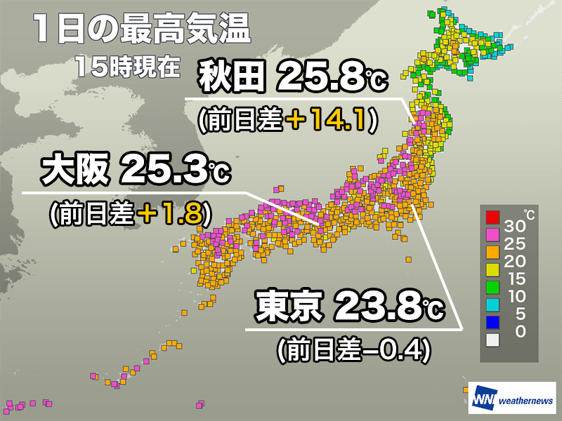 15時までの最高気温は札幌市で昨日より9.9℃高い18.7℃、秋田市は14.1℃も高い25.8℃で今年初めての夏日です。