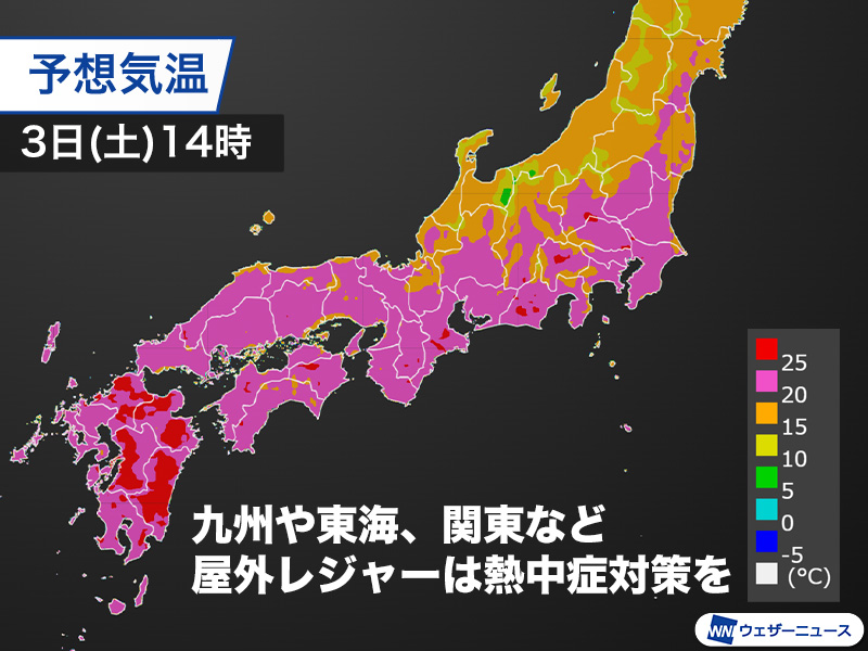 朝から日差しがしっかりと届くことで気温が上がり、九州や東海、関東などは最高気温が25℃前後の予想です。長時間、日向で活動をする場合は念のため熱中症対策を心がけてください。