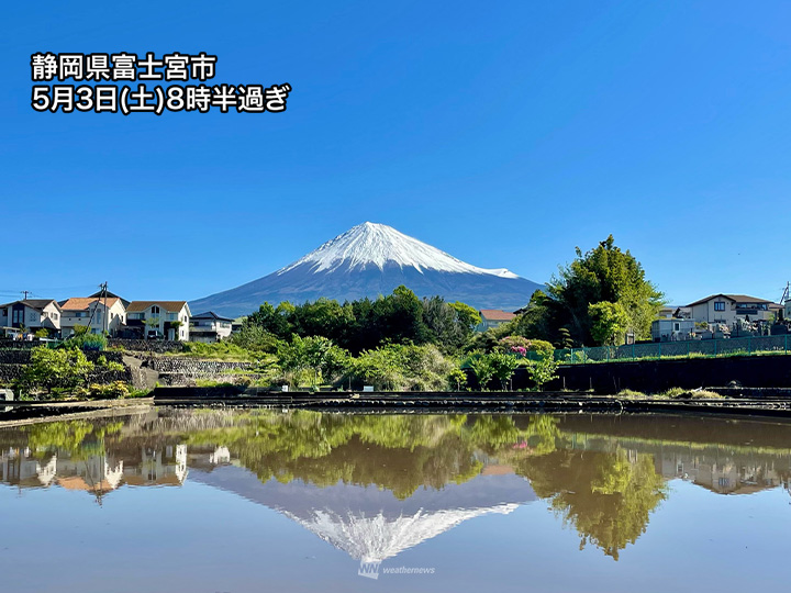 今日に加え、明日4日(日)・みどりの日の日中や5日(月)・こどもの日も晴天が期待できますので、4連休中は富士山らしい美しさを堪能できそうです。