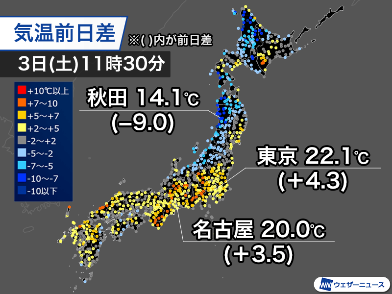 11時30分の時点で東京都心はすでに20℃を超える22.1℃まで上がり、昨日の同じ時間よりは4.3℃高い気温です。名古屋市も3.5℃高い20.0℃まで上がってきました。