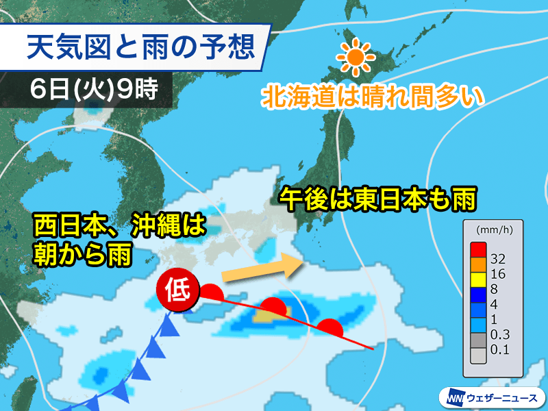 前線を伴った低気圧が九州の南に進み、朝の時点で西日本の大部分や東海の一部で雨が降る見込みです。低気圧の東進に伴い、午後に関東など東日本の広い範囲に加え、東北でも雨の降る所があります。日差しが期待できるのは北海道だけになる見通しです。