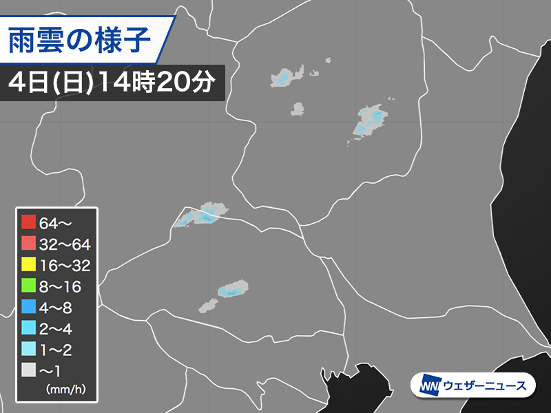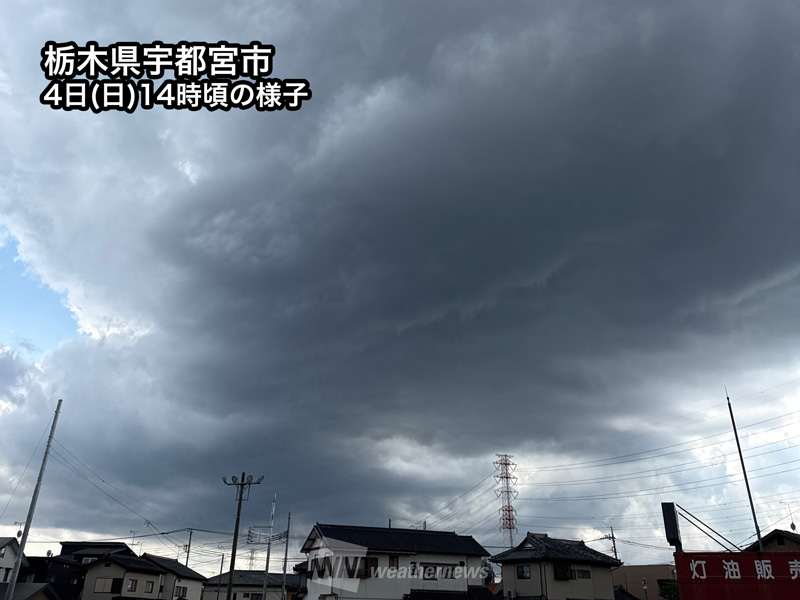 上空に寒気を伴った気圧の谷の接近と異なる方向の風の衝突によって、関東北部では13時頃から小さな雨雲が発生し始めました。14時頃には栃木県宇都宮市上空でも雨雲が急発生して雨を降らせています。発雷は検知されていませんが、一時的な強雨や雷雨、降雹などにも注意が必要です。