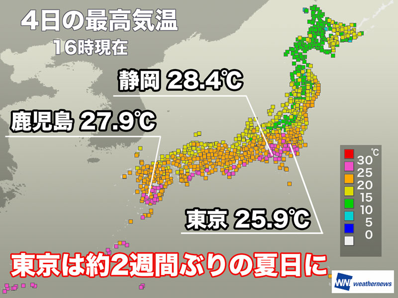 16時時点の最高気温は東京で25.9℃、静岡で28.4℃(今年最高)、鹿児島で27.9℃でした。東京は4月21日(月)以来、約2週間ぶりの夏日です。
