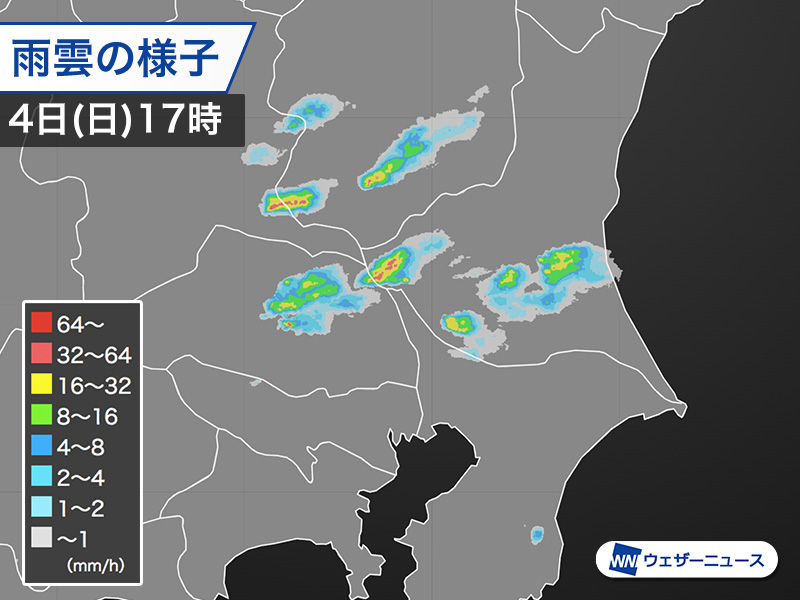 今日4日(日)の関東は気圧の谷の接近に伴って雨雲が発生・発達し、強雨や雷雨となっているところがあります。雷雨となったさいたま市のアメダスでは15時に23.4℃だった気温が雨の影響で16時には19.5℃まで下降しました。