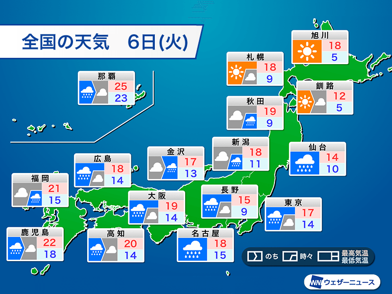 ゴールデンウィーク最終日の明日6日(火)・振替休日は、天気が崩れる西日本から東北で気温が上がりません。雨が降って日差しが届かないことで朝から横ばいとなり、昼前でも気温が10℃台の所が多くなります。