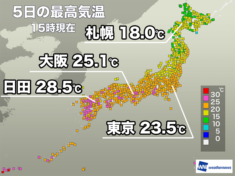 15時までの最高気温は西日本から東海、関東で25℃前後まで上昇。特に九州で高く、大分県日田市で28.5℃、福岡県太宰府市は27.6℃を観測しました。そのほか、大阪市の最高気温は25.1℃、東京都心は23.9℃です。