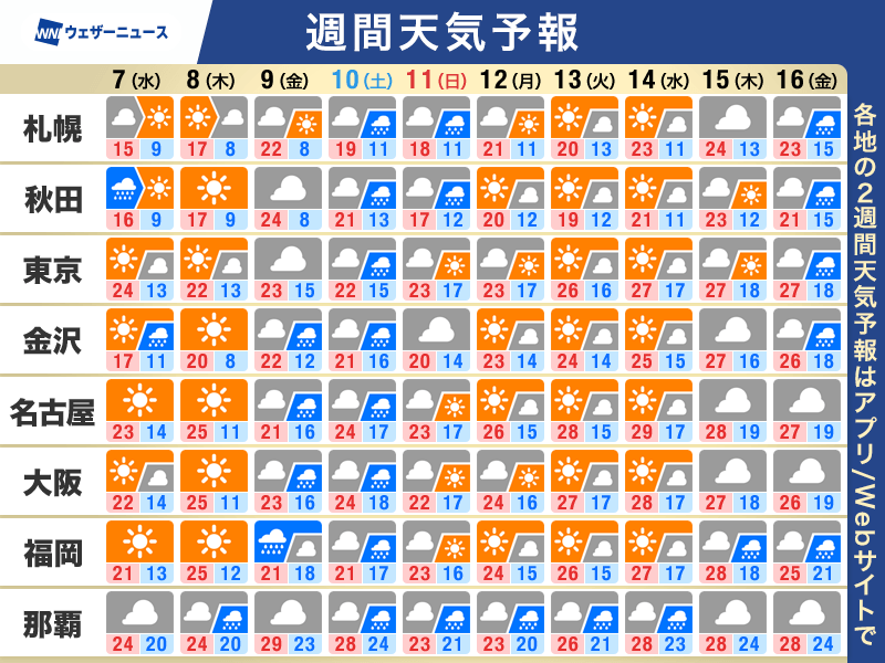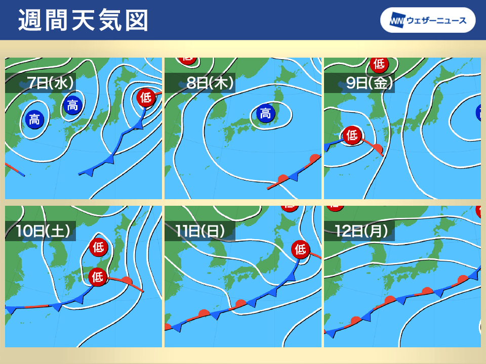 7日(水)〜8日(木)は高気圧が日本付近を東進し、各地で晴れるタイミングがあります。9日(金)は天気が下り坂で、低気圧の接近する西日本から雨が降りだします。週末の10日(土)は広範囲で雨が降る見込みです。