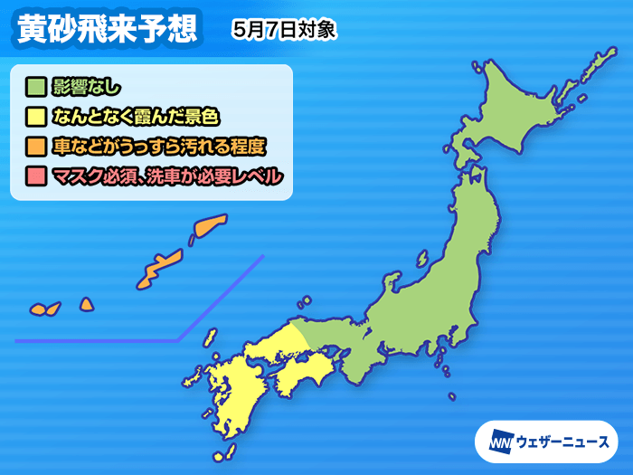 日本付近には、今日広い範囲で雨を降らせている低気圧が通過した後、西北西の風に流されて沖縄から西日本方面に飛来する見込みです。日本の上空に到達する頃にはかなり薄くなり、黄砂が付着するなどの影響が出るのは沖縄〜奄美が中心になると予想しています。西日本方面では上空が霞んで見える程度の影響にとどまる見通しです。
