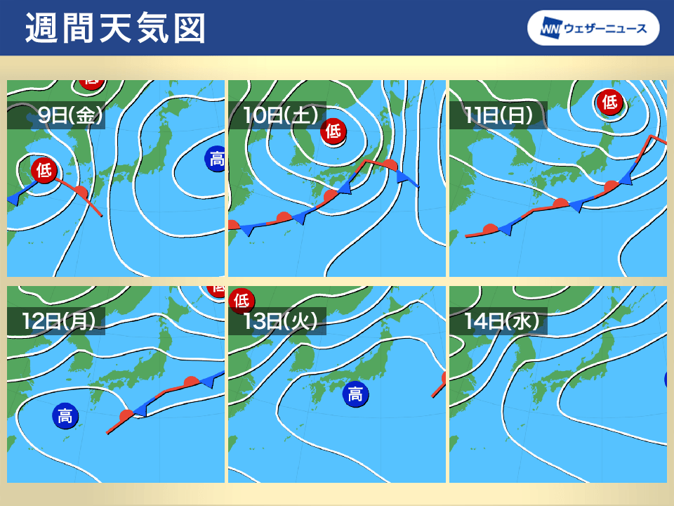 9日(金)は大陸から低気圧や前線が接近します。西日本から天気が下り坂となり、夜遅くには関東付近まで雨の範囲が広がる予想です。10日(土)は雨の中心が東日本から北日本へと移っていきます。