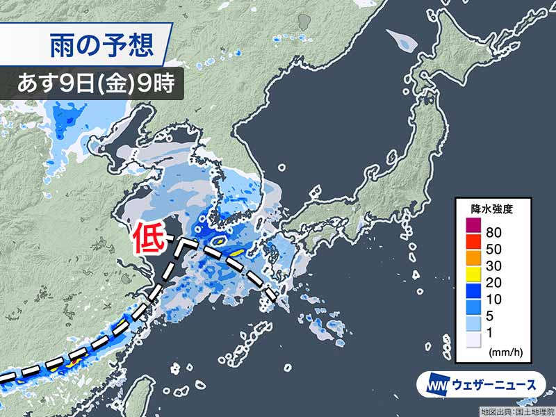 明日9日(金)は低気圧が東シナ海から朝鮮半島付近に進み、温暖前線が西日本に接近します。九州では朝から雨で、関西や東海でも午後は雨の所が多くなる予想です。夜には関東付近まで雨の範囲が広がる見込みです。