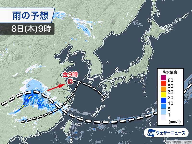 中国に大雨をもたらしている前線は、明日9日(金)になると日本列島に近づく見込みです。明日朝には朝鮮半島の西に低気圧が発生し、前線が九州にかかり始める予想となっています。