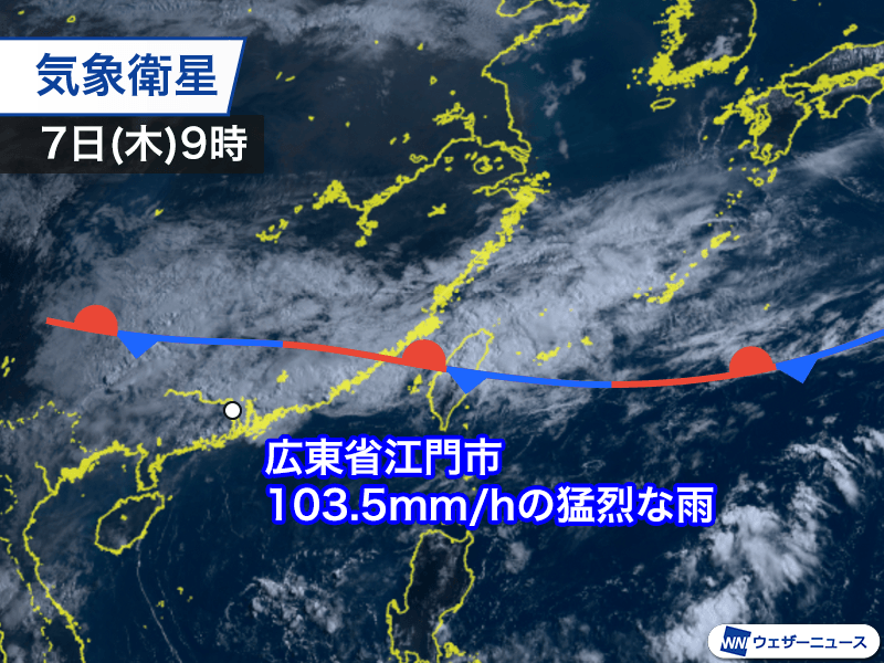 中国大陸の南部に伸びる前線に向かって、相当温位340K以上の日本で梅雨の時期に大雨をもたらすような、非常に暖かく湿った空気が流れ込み、雨雲が発達しました。昨日7日(水)は広東省を中心に1時間に50mmを超えるような非常に激しい雨が降り、江門市では1時間に103.5mmの猛烈な雨を観測しています。