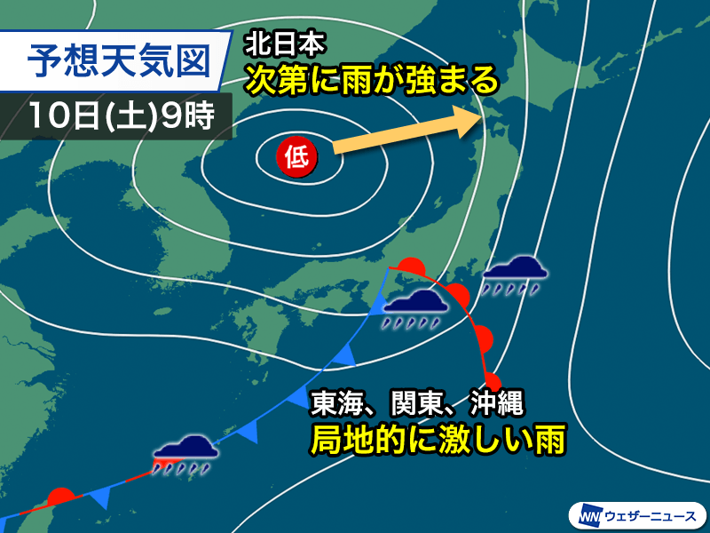 明後日10日(土)は低気圧が日本海に進み、本州の太平洋側を前線が通過する見通しです。南からの湿った空気の流入は継続し、東海から関東の沿岸部を発達した雨雲が通過するとみられます。