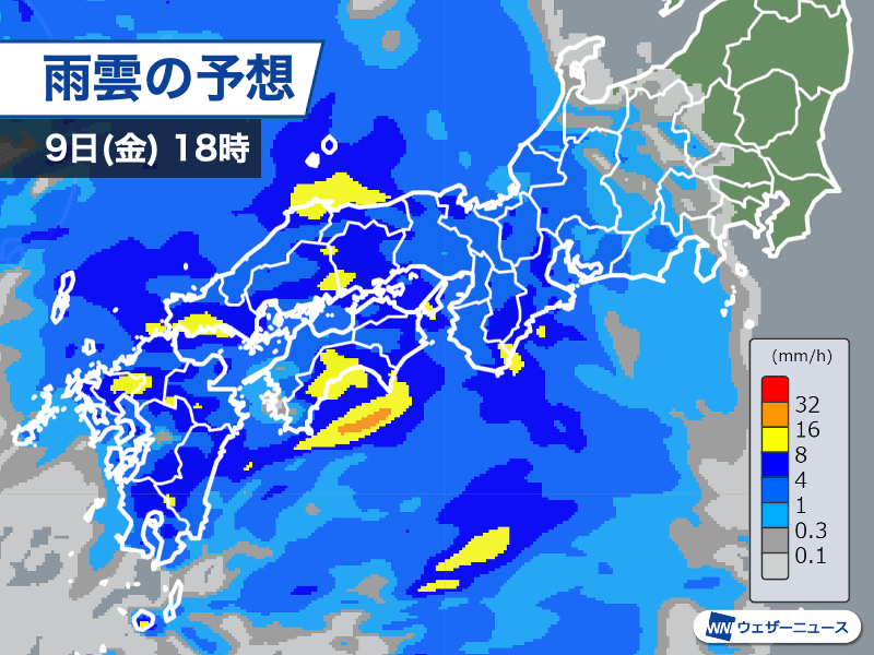 低気圧や前線の東進に伴い、近畿でも弱い雨が降り出しています。昼過ぎには東海まで雨の範囲が拡大する見込みです。夕方の帰宅時間には本降りの雨となって、夜は太平洋側の地域を中心に1時間に30mm以上の激しい雨となるおそれがあります。