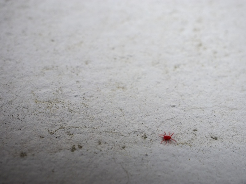 「カベアナタカラダニは赤い虫なので、血を吸っているようにも見えますが、花粉や昆虫を摂食する雑食性のダニです。ブロック塀の壁面やコンクリートを這い回っている姿をよく目撃しますが、人の目では見えないような微細な花粉を食べにきていることもあるようです」