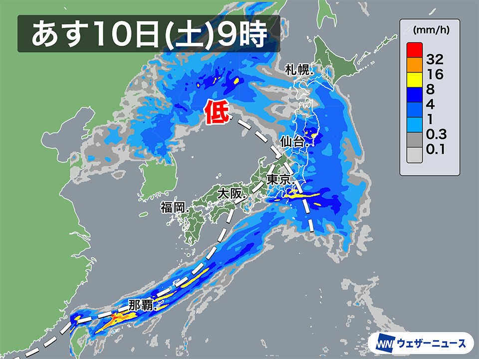 また、本州付近からのびる寒冷前線が奄美を通過して沖縄付近に南下します。こちらも活動が活発で、沖縄では大雨や落雷のおそれがあります。前線は沖縄本島付近まで南下したあと停滞する予想で、県内では断続的に11日(日)にかけて雨が強まる可能性があるため注意してください。