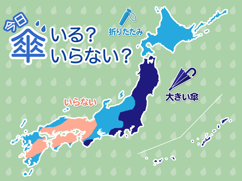 前線が通過し、東日本や東北では雨が降ります。本降りの雨となることもあるので、お出かけには大きい傘が良さそうです。