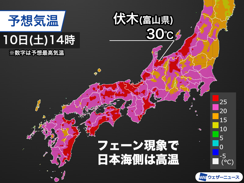 特に、南寄りの風が山越えとなってフェーン現象が発生する日本海側の地域で気温が上がりやすく、富山県高岡市・伏木など30℃の真夏日になる所もあるとみられます。石川県金沢市や富山市は29℃予想ですが、もし30℃に到達すれば今年初めてです。