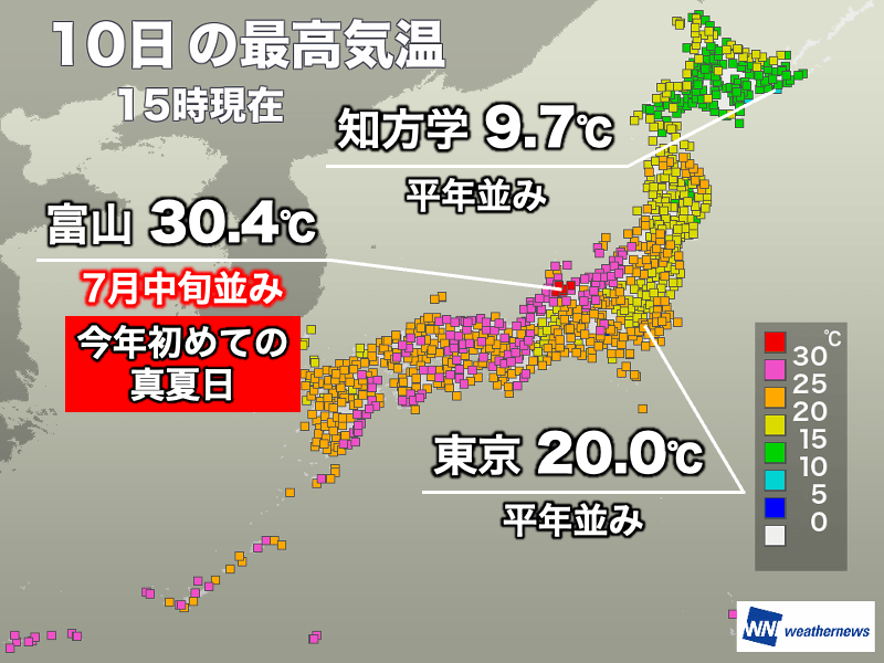 特に、北陸から山陰にかけての日本海側では西寄りの風や南寄りの風が山を越えてフェーン現象も発生したため気温が高く、午前中から25℃を突破、午後には富山で今年初めて30℃以上の真夏日になっています。15時までの全国の最高気温のランキングは、7位までを富山県が独占し、10位まで見ても全て北陸となりました。