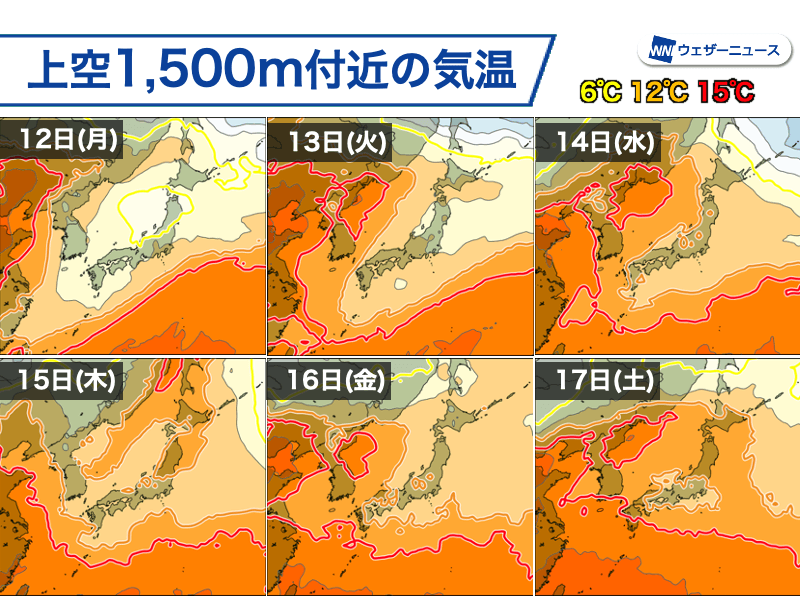 ただ、13日(火)以降は全国的に上空1500m付近で9〜12℃の空気に覆われる見込みです。特に、13日(火)〜14日(水)は高気圧に覆われるため晴れる所が多く、気温が上がりやすくなります。
