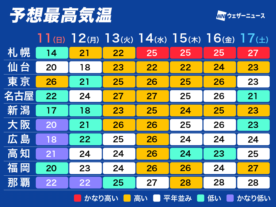 主要都市のこの先一週間の予想最高気温を見ると、14日(水)は北海道から九州で平年より高く、ほとんどの地点で25℃以上になっています。札幌で25℃以上になれば、今年初めてです。