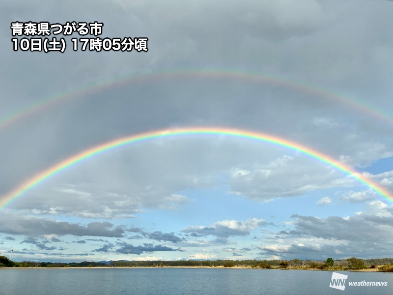 東北は、日本海にある低気圧からのびる前線の影響で、北部を中心に雨が降っていました。この前線本体に伴う雨は止んだ所が多いものの、日本海から別のシアライン(風の流れが変化する境界線)が接近して、再び秋田県沿岸部など日本海側で雨が降り出しています。これらの雲の隙間に入った所で、虹が見られているようです。