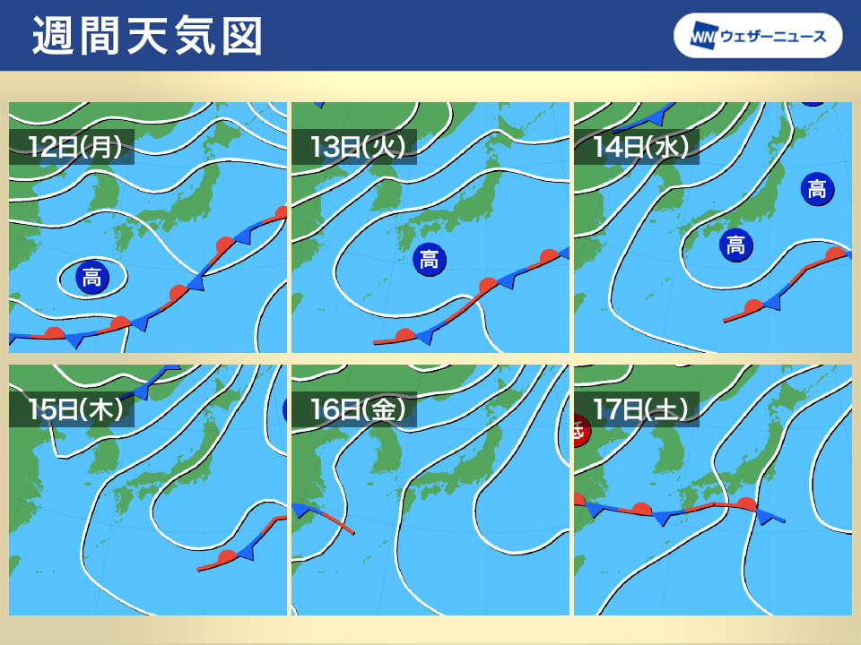 13日(火)から14日(水)頃は、高気圧に覆われて全国的に晴れるところが多くなります。
