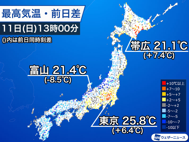 前日に比べて気温の変化が顕著なのは北海道・道東の十勝地方です。低気圧が通過した昨日10日(土)は雨が降り低温で推移しましたが、今日11日(日)は天気が回復し、フェーン現象の影響で気温が上昇しています。帯広の13時までの最高気温は21.1℃で、前日と比べて7.4℃高い気温です。