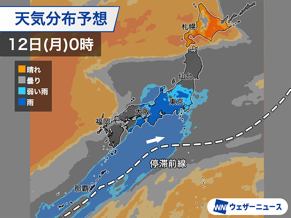 あす12日(月)朝になると、雨雲がかかるのは関東や東北南部が中心となり、西日本では雨のやむところが多くなる見通しです。その後の天気の回復はゆっくりで、日中も雲の多い空の続くところが多そうです。