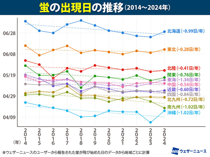 ウェザーニュースの調べでは、蛍の出現時期が早まっている傾向が見られました。これには温暖化が影響しているとみてよいのでしょうか。