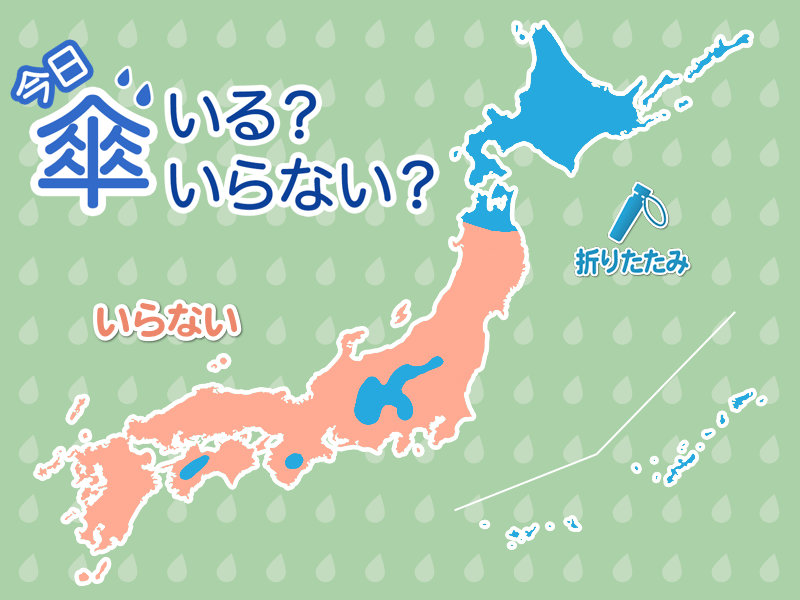北海道や南西諸島、本州の内陸の一部では、雲が広がりにわか雨の可能性があります。外出時は折りたたみ傘があると安心です。