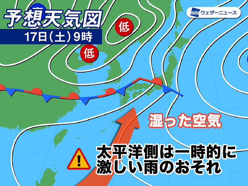 17日(土)は大陸から接近する前線が本州付近を通過して、広い範囲で雨が降る予想です。西日本や東日本では朝から雨が降り、傘が手放せない1日になりそうです。雨のエリアは次第に北日本にも拡大します。