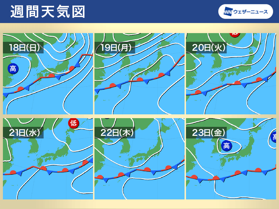 大陸からのびる梅雨前線は、来週にかけて本州の南海上に停滞します。西日本や東日本は雲が広がりやすく、雨の降る日がありそうです。九州南部は18日(日)にかけて大雨に警戒が必要です。
