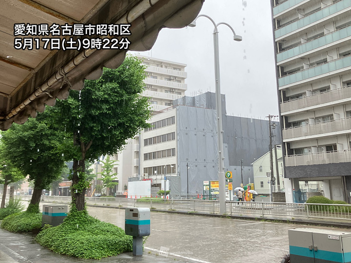 昨夜から今日の早朝は西日本が雨の中心でしたが、この時間になって活発な雨雲が東に移動し、東海地方で雨が強まってきました。9時20分までの1時間には岐阜県多治見市で14.5mm、愛知県蒲郡市で11.0mm、静岡県浜松市・三ヶ日で10.0mmのやや強い雨を観測しています。