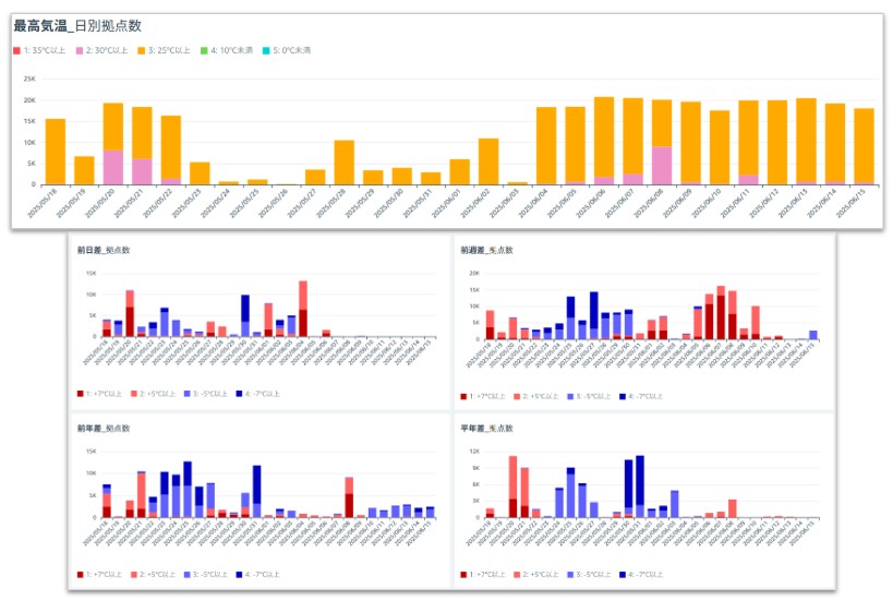 また、気温の種類(最高気温(最低気温)もしくは各種気温差)ごとの、指定した期間の拠点数割合、エリア別の拠点数を確認できます。
