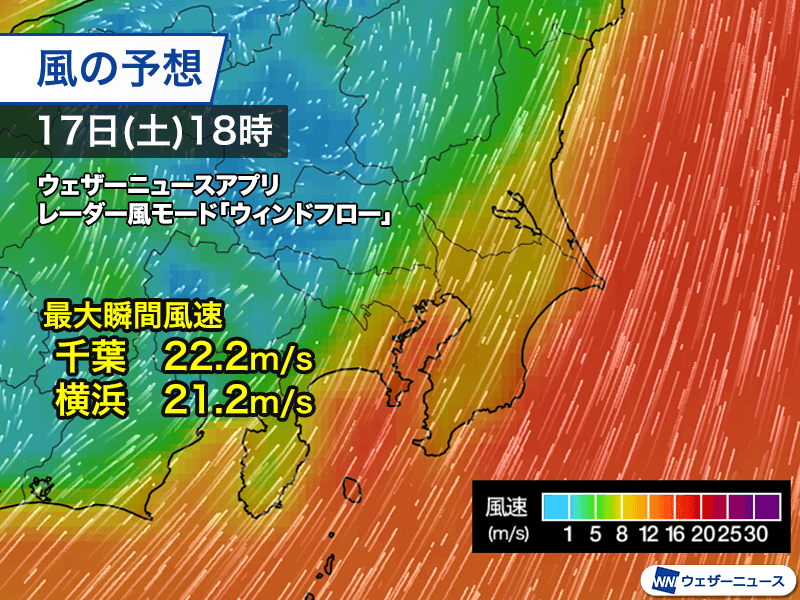 雨のピークを過ぎた15時前後から風が吹き荒れていて、17時20分までの最大瞬間風速は千葉市で22.2m/s、東京都江戸川区・江戸川臨海で22.0m/s、横浜市で21.2m/sなど、広範囲で20m/s超の強風です。