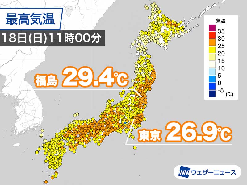 南西諸島など島しょ部を除いて最も高い気温は福島県浪江の29.9℃です。福島も29.4℃を観測して今年最も高い最高気温を更新しています。上空の暖気と日照の影響により、急ピッチで気温が上がりました。
