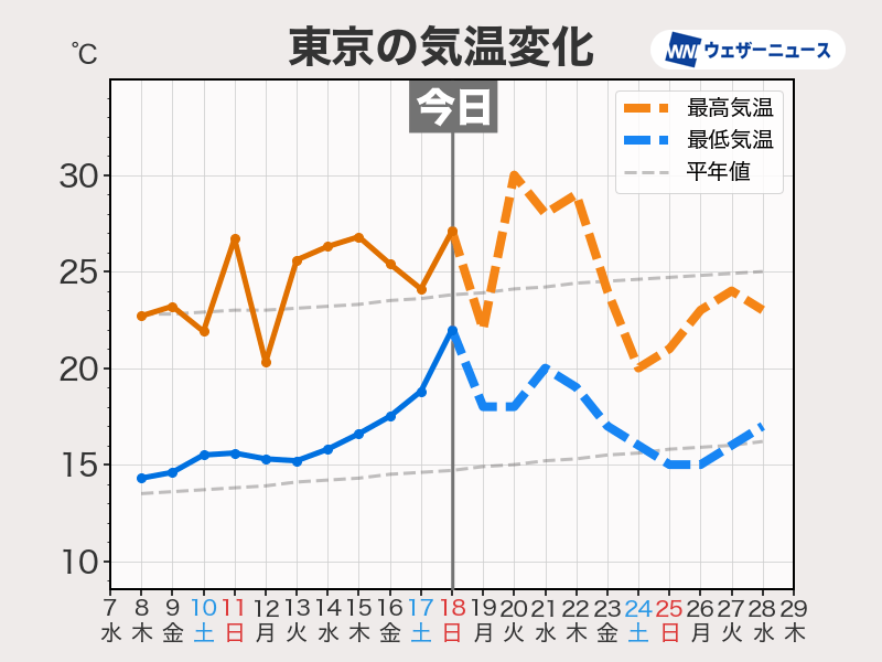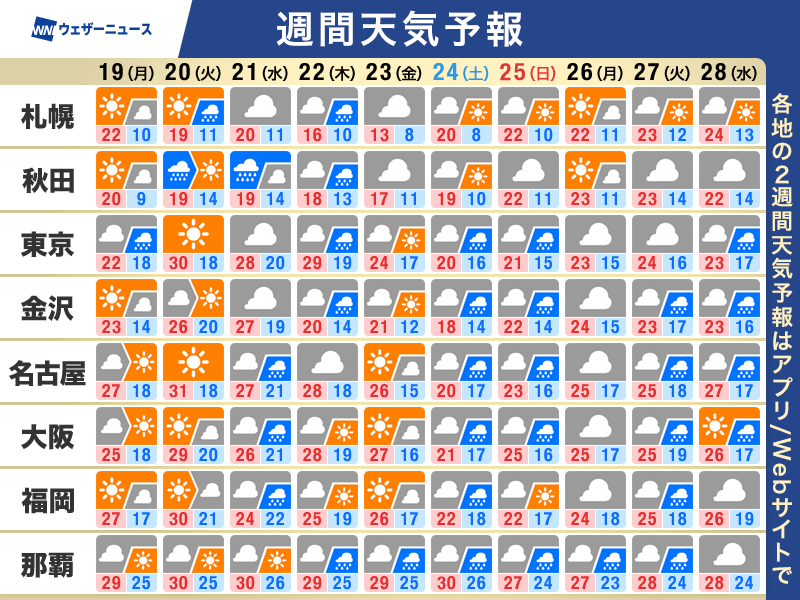 19日(月)は西日本や東日本は気温が平年並みか低めで、関東では冷たい海上からの東風が吹くことで涼しくなる予想です。前日との気温差にご注意ください。