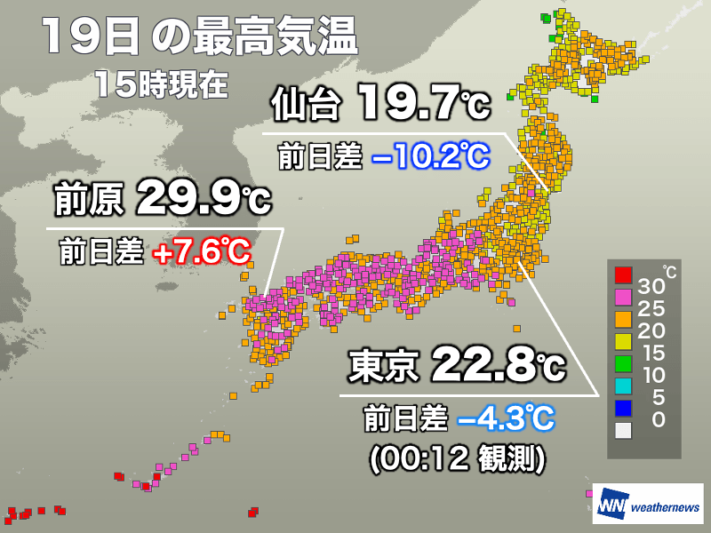 一方、海からの冷たい東寄りの風が吹き込む関東や東北太平洋側は、気温があまり上がっていません。東京の最高気温22.8℃は日付が変わってすぐの00時12分に観測されたもので、日中は大きく見ると気温が右肩下がりになっています。15時00分時点の気温は18.6℃と、20℃を下回り、昨日の同時刻に比べると7.1℃も低い状況です。ウェザーニュースアプリを通していただいた体感報告も「肌寒い」が多くなりました。