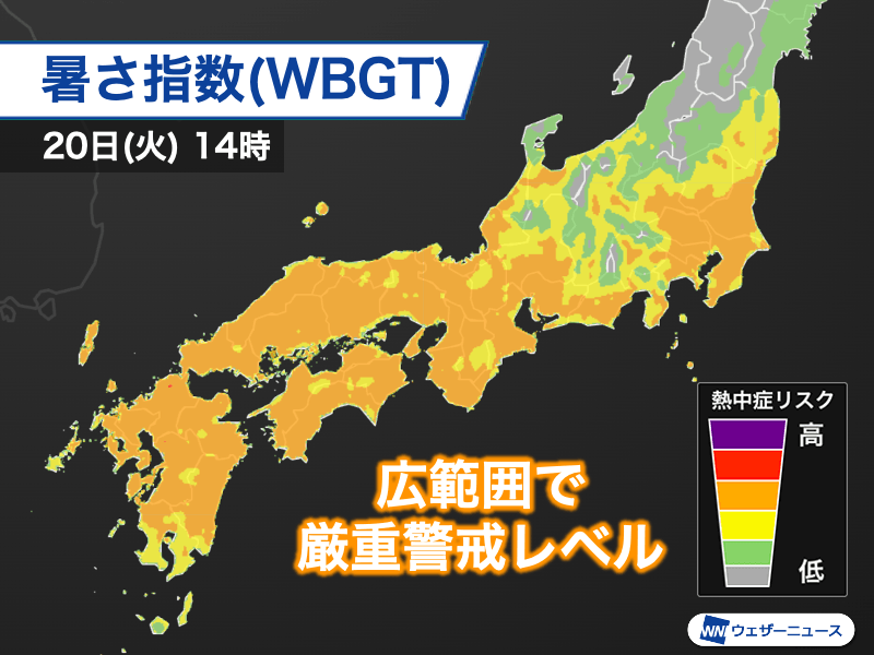 14時の暑さ指数(WBGT)の予想を見ると、関東から九州は広い範囲で「厳重警戒」レベルのオレンジ色となっています。屋外での活動は特に注意が必要です。こまめに日陰で休憩する・水分や塩分を摂るなど、熱中症対策を万全に行なってください。運動会シーズンでもありますが、無理はしないようお願いします。