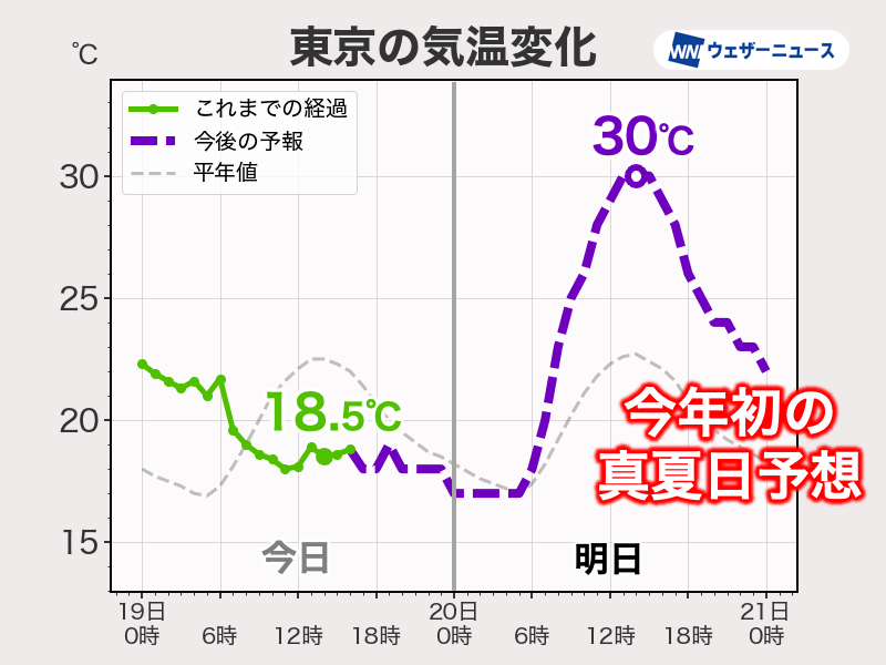 東京は、今年初めて30℃以上の真夏日になるとみています。昼間も肌寒いくらいだった今日19日(月)に比べて10℃以上高く、体に堪える暑さになりそうです。
